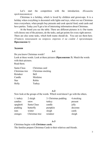 Документ описывает внеклассное мероприятие по английскому языку на тему 'Рождество в Великобритании', организованное для учащихся 7-9 классов. Основные цели мероприятия включают ознакомление с рождественскими традициями, развитие интерактивных навыков и практику устной речи. В ходе мероприятия проходят конкурсы и задания, на которых учащиеся демонстрируют свои знания о празднике.