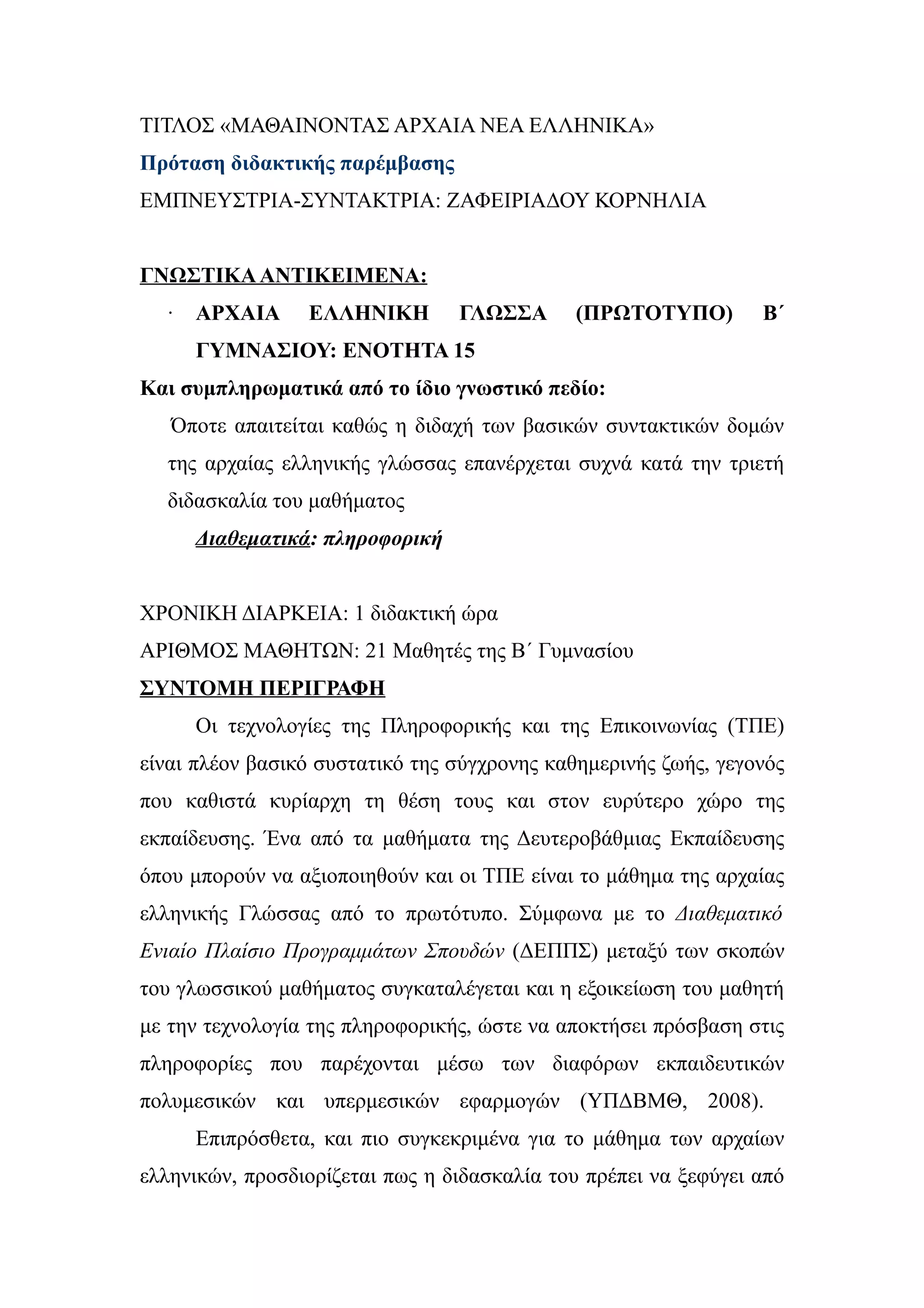 όπου μπορούν να αξιοποιηθούν και οι ΤΠΕ είναι το μάθημα της αρχαίας
