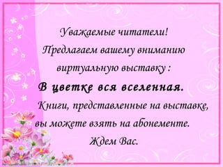 Документ представляет собой каталог книг о цветоводстве, включая пособия для учителей, справочники и альбомы о различных растениях и их выращивании. Каждая работа охватывает уникальные аспекты, начиная от ухода за комнатными растениями до агротехники и дизайна цветников. Эти издания направлены на широкий круг читателей, включая как профессионалов, так и любителей цветоводства.
