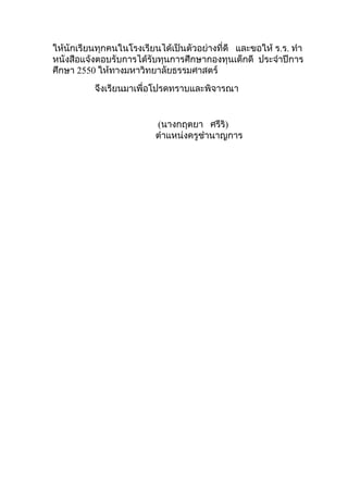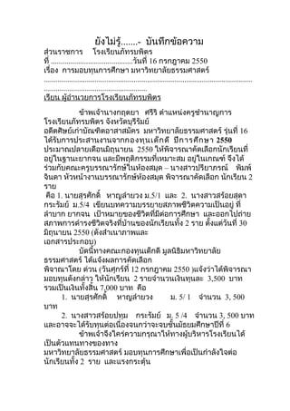 ทำา หนังสือแจ้งตอบรับการได้รับทุนการศึกษากองทุนเด็กดี ประจำาปีการ ศึกษา 2550 ให้ทางมหาวิทยาลัยธรรมศาสตร์ จึงเรียนมาเพื่อโปรดทราบและพิจารณา (นางกฤตยา ศรีริ) ตำาแหน่งครูชำานาญการ