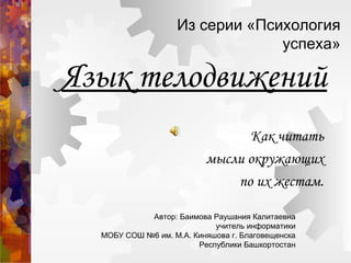 Документ обсуждает язык телодвижений и его значение в общении, подчеркивая важность невербального общения, которое составляет 55% всех взаимодействий. Он описывает различные жесты и мимику, а также зоны личного пространства, акцентируя внимание на том, как распознавать истинные эмоции и намерения окружающих. Основная цель работы — научить читателей интерпретировать жесты и улучшать коммуникацию в различных социальных и деловых контекстах.