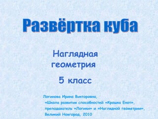 Документ представляет план уроков по наглядной геометрии для 5 класса, содержащий задания на тему развертки куба. В нем описаны различные задания, включающие сборку куба из деталей, создание и проверку разверток, а также вопросы для понимания свойств куба. Литература, используемая для уроков, указана в конце документа.