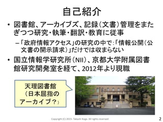 第5回LRGフォーラム「これからのアーカイブを考える-アーカイブサミット2015を受けて」(2015年4月5日、横浜市関内・さくらWORKS)での発表。2015年1月に東京で開催された「アーカイブサミット2015」や、それに先立ち提示された「アーカイブ立国宣言」(文化資源戦略会議)を批評しつつ、日本におけるこれからの「アーカイブ」のあり方を論じた。