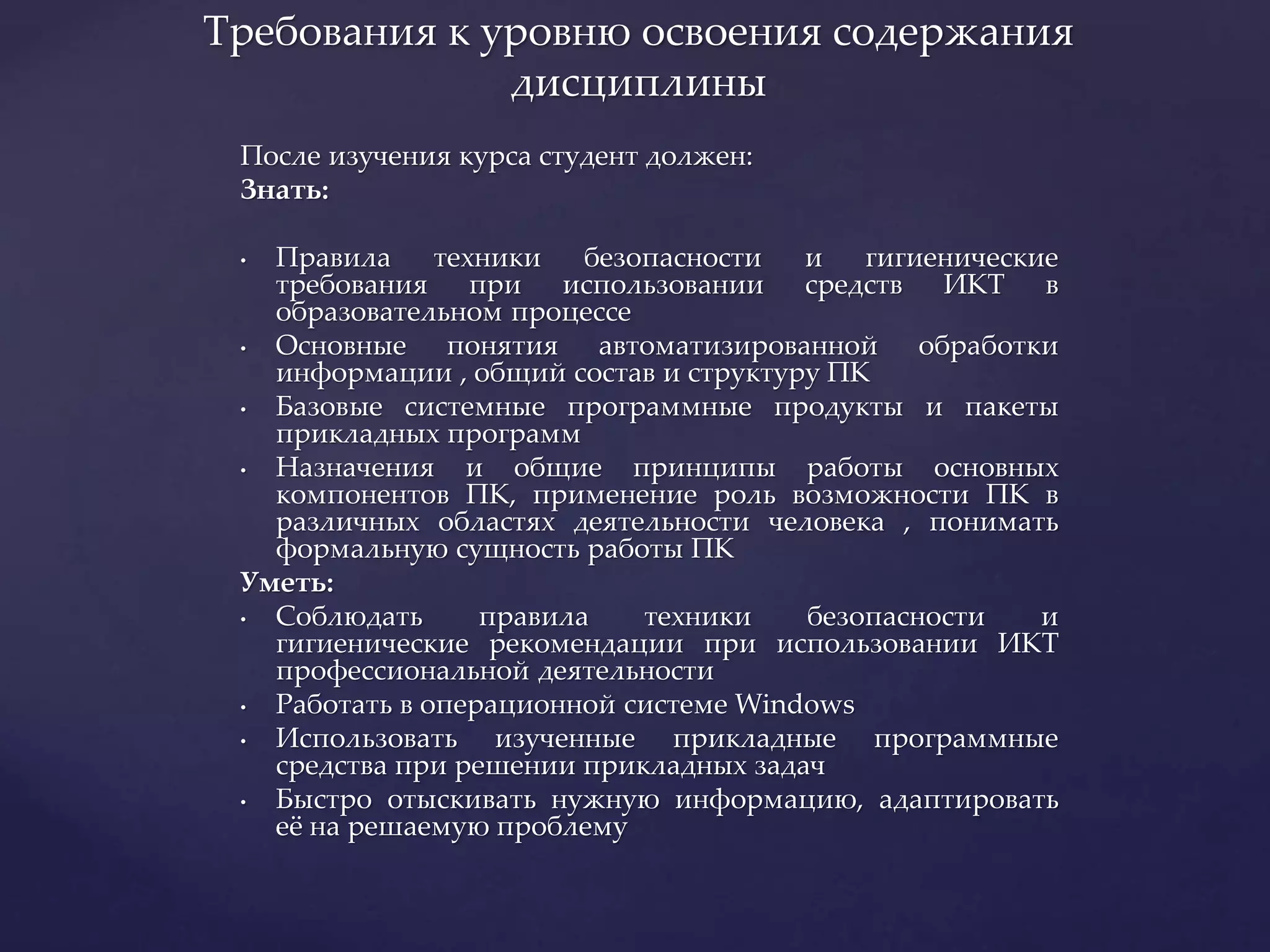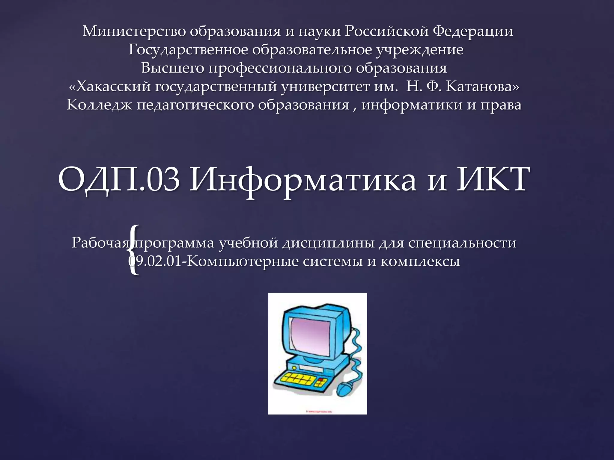 Документ представляет рабочую программу учебной дисциплины по информатике и ИКТ для специальности компьютерные системы и комплексы. В программе обозначены цели и задачи, знания и умения, которые должны приобрести студенты, а также распределение времени на лекции, семинары и лабораторные работы. Также приводится тематика и рекомендованная литература для изучения.
