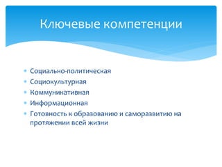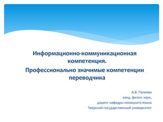 Документ обсуждает информационно-коммуникационную компетенцию и ее значимость для переводчиков. Он определяет ключевые компетенции и уровни владения, необходимые для эффективного выполнения профессиональных задач в области перевода. Также рассматриваются компетенции, такие как лингвистическая, операциональная и социокультурная, которые важны для успешной работы переводчика.