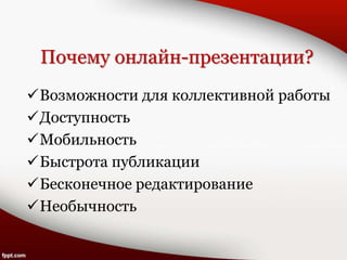 Документ представляет обзор различных онлайн-сервисов для создания презентаций и видео, включая возможности коллективной работы, импорт и экспорт файлов, а также примеры использования. В нем описаны сервисы, такие как Google Презентации, Zoho Show, Prezi и другие, с акцентом на их функционал и пользовательские опции. Также предложены задания для практического применения полученных знаний в создании читательских дневников и видеопрезентаций.