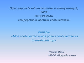 Документ описывает программу 'Лидерство в местных сообществах', направленную на улучшение экологической ситуации в республике Беларусь через создание школьных экологических отрядов и общественных экологических постов в пяти сельских районах. Основные действия включают экологическое обучение, проведение семинаров и общественную экологическую экспертизу, результатом которых стали отчёты о загрязнении и выявленные проблемы. В планах на 2015/2016 год - создание новых экологических постов и продолжение работы с местными сообществами для решения экологических проблем.