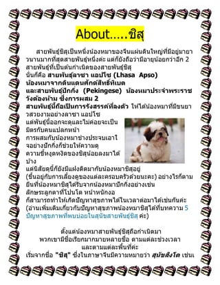 เริ่มจากชื่อ "ชิสุ" ซึ่งในภาษาจีนมีความหมายว่า สุนัขสิงโต เช่นเ