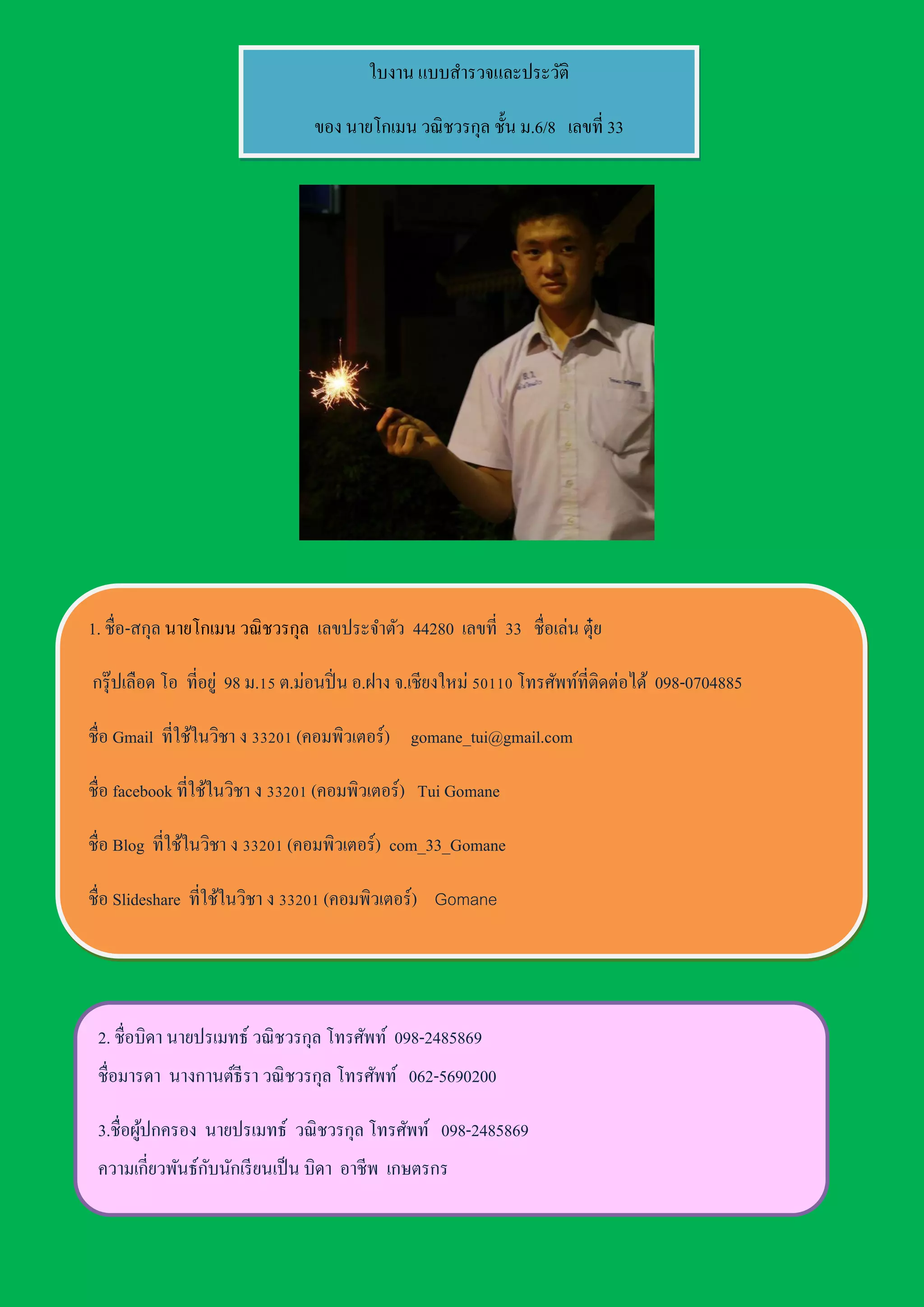 วณิชวรกุล ชั้น ม.6/8 เลขที่ 33 1. ชื่อ-สกุล นายโกเมน วณิชวรกุล เลขประจาตัว 44280 เลขที่ 33 ชื่อเล่น ตุ๋ย กรุ๊ปเลือด โอ ที่อยู่ 98 ม.15 ต.ม่อนปิ่น อ.ฝาง จ.เชียงใหม่ 50110 โทรศัพท์ที่ติดต่อได้ 098-0704885 ชื่อ Gmail ที่ใช้ในวิชา ง 33201 (คอมพิวเตอร์) gomane_tui@gmail.com ชื่อ facebook ที่ใช้ในวิชา ง 33201 (คอมพิวเตอร์) Tui Gomane ชื่อ Blog ที่ใช้ในวิชา ง 33201 (คอมพิวเตอร์) com_33_Gomane ชื่อ Slideshare ที่ใช้ในวิชา ง 33201 (คอมพิวเตอร์) Gomane 2. ชื่อบิดา นายปรเมทธ์ วณิชวรกุล โทรศัพท์ 098-2485869 ชื่อมารดา นางกานต์ธีรา วณิชวรกุล โทรศัพท์ 062-5690200 3.ชื่อผู้ปกครอง นายปรเมทธ์ วณิชวรกุล โทรศัพท์ 098-2485869 ความเกี่ยวพันธ์กับนักเรียนเป็น บิดา อาชีพ เกษตรกร