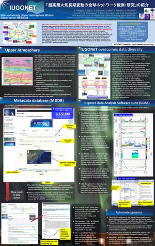 The Inter-university Upper Atmosphere Global Observation NETwork (IUGONET) is a six-year Japanese project running from 2009-2014 involving five universities to build a metadata database of ground-based observational data of the upper atmosphere. The database will provide researchers access to various radar, magnetometer, and other observational data collected across different institutions to facilitate new cross-disciplinary analysis. The project is also developing data analysis software to help researchers download, visualize, and analyze the data.