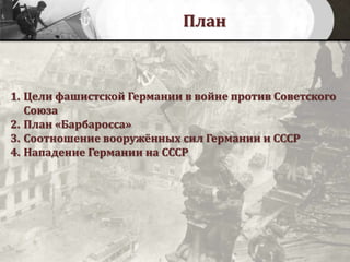 Документ охватывает ключевые аспекты Великой Отечественной войны, включая цели фашистской Германии, план «Барбаросса» и соотношение сил между Германией и СССР. Рассматриваются различные стратегии войны, включая нападение на СССР 22 июня 1941 года. Документ также затрагивает пропагандистские кампании, которые проводила Германия в начале войны.