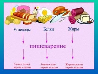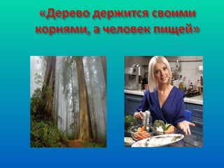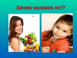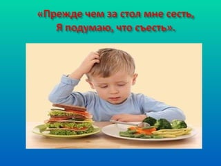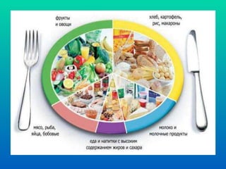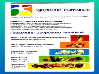 Документ обсуждает важность здорового питания и соблюдения режима дня для поддержания здоровья. Он подчеркивает необходимость избегать вредных привычек и стремление к физической активности и гигиене. Также рассматриваются примеры полезных и неполезных продуктов, а также рекомендации по организации питания в течение дня.