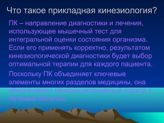 Документ подробно описывает прикладную кинезиологию как метод диагностики и лечения, опирающийся на мышечное тестирование, что позволяет установить дисбаланс в системах организма. Он подчеркивает уникальность подхода прикладной кинезиологии, который сочетает принципы ортодоксальной медицины и традиционных методов, обеспечивая холистический взгляд на здоровье пациента. Важность индивидуального подхода и использование неинвазивных методов для мониторинга состояния здоровья также акцентируются в документе.