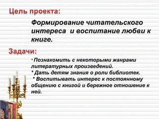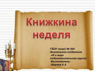 В документе описывается деятельность подготовительной группы дошкольного отделения "Я и мир" лицея № 504, посвященная формированию читательского интереса у детей в рамках "книжкиной недели". В ходе мероприятия были проведены чтения, выставки, создание художественных работ и экскурсия в школьную библиотеку, что способствовало развитию любви к книге и осознанию ее значимости. Итогом недели стало учреждение "книжкиной больницы" по инициативе детей.