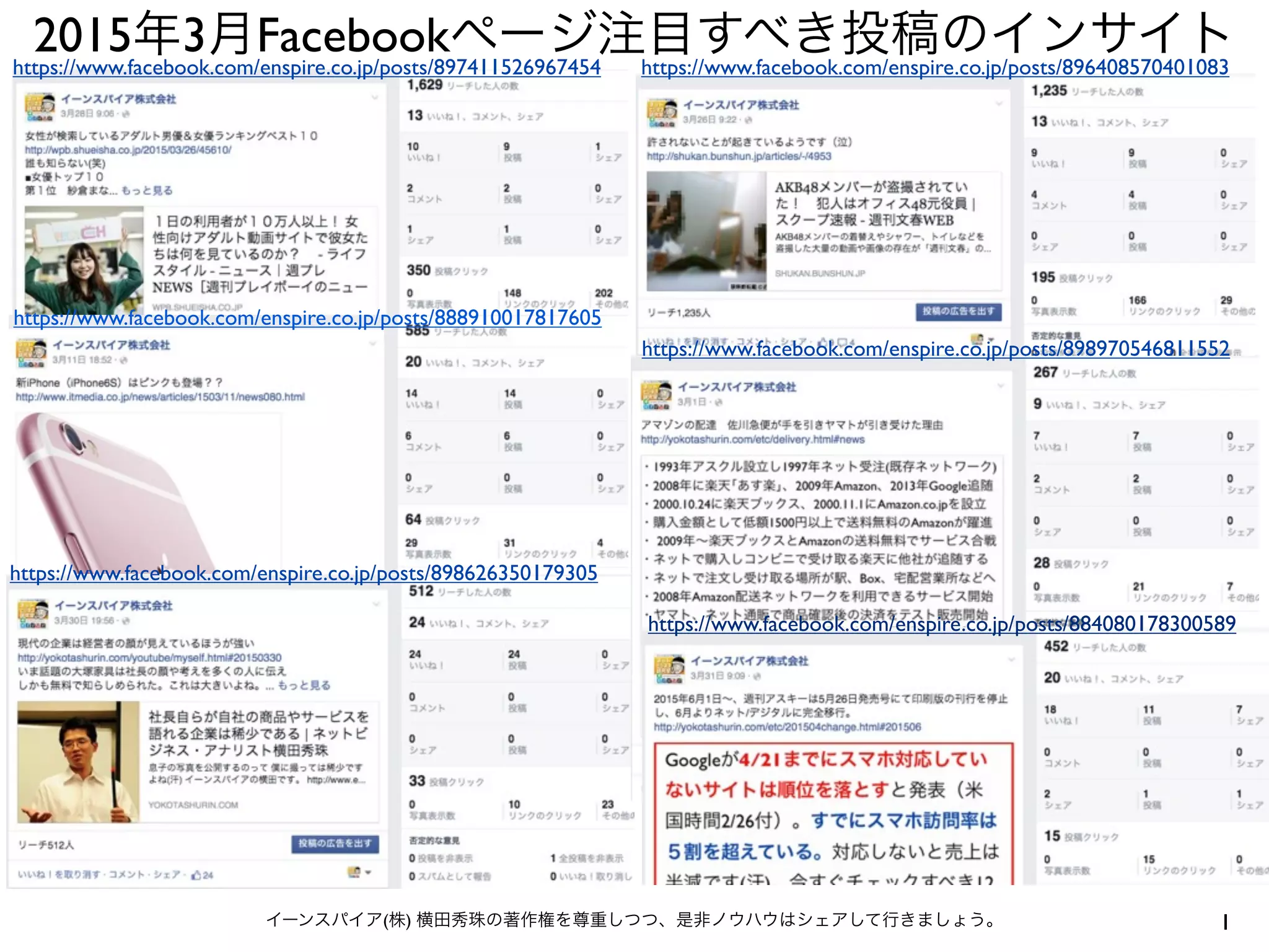 2015年3月Facebookページ注目すべき投稿のインサイト イーンスパイア(株) 横田秀珠の著作権を尊重しつつ、是非ノウハウはシェアして行きましょう。 1 https://www.facebook.com/enspire.co.jp/posts/897411526967454