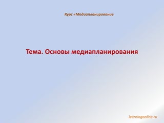 Документ представляет основы медиапланирования, включая цели рекламной кампании, стратегии и важные термины, такие как рейтинг и доля аудитории. Он описывает этапы разработки медиаплана, возможные цели медийной составляющей и различные виды размещения рекламы. Также упоминаются ограничения на размещение рекламных роликов и предлагается возможность задать вопросы по теме.