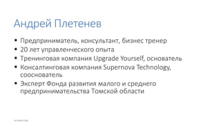 Андрей Плетенев, предприниматель и бизнес-тренер с 20-летним опытом, обсуждает значение доверия в управлении и бизнесе. Доверие, по его определению, заключается в ожидании, что стороны будут действовать в интересах друг друга, даже при отсутствии контроля. Документ охватывает аспекты построения доверия в командах и с клиентами, а также механизмы его потери и восстановления.