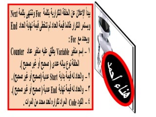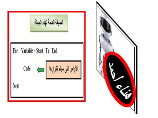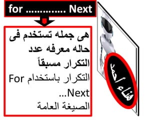 تتناول الوثيقة استخدام جملة عدد محدد مسبقًا لحالة التكرار في البرمجة باستخدام الصيغة العامة 'for ... next'. تحتوي على مثال يوضح كيفية تطبيقها من خلال كود يتضمن عمليات مثل زيادة العداد وإظهار رسائل. يتم استخدام المتغير 'm' في هذا السياق.