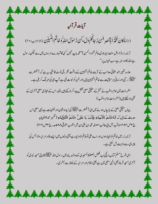 نبی کریم صلی اللہ علیہ وآلہ وسلم کا فیضان ترجمہ:۔ (از اہل سنت دیو بندی عالم محمود الحسن)’’محمد باپ نہیں کسی کا تمہارے مردوں میں سے لیکن رسول ہے اللہ کا اور مہر ہے سب نبیوں پر ‘‘