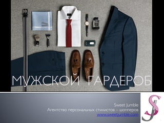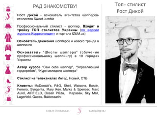 Документ представляет агентство персональных стилистов 'Sweet Jumble', основанное Ростом Дикой, который является одним из лучших стилистов Украины и автором обучающих курсов по шоппингу. Он предлагает мастер-классы по выбору цвета, фактуры и основам мужского гардероба, включая ключевые элементы одежды и обуви. В документе также содержится информация о сегментации клиентов и их предпочтениях в одежде с примерами ценового диапазона для делового шопинга.