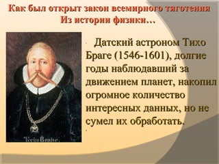 Документ описывает историю открытия закона всемирного тяготения, начиная с трудов Тихо Браге и Иоганна Кеплера, и заканчивая работой Исаака Ньютона, который в 1667 году опубликовал свои выводы о силе притяжения. Он также включает объяснение взаимодействия между телами и значение гравитационной постоянной, а также эксперименты, подтверждающие эти теории. Ньютон сформулировал закон всемирного тяготения, показав, что сила притяжения пропорциональна массе взаимодействующих тел и обратно пропорциональна квадрату расстояния между ними.