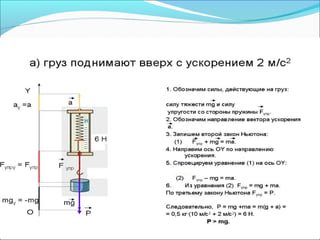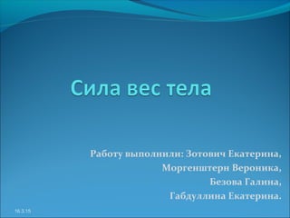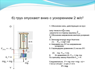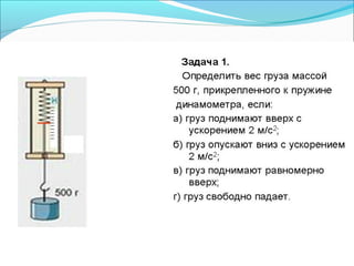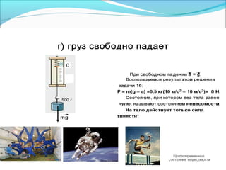 Документ описывает основные физические понятия о весе тела, включая формулу для расчета веса и влияние ускорения на этот параметр. Указывается, что вес тела в зависимости от его движения может изменяться, и приводится пример задачи, связанной с вычислением веса в различных средах. Работа выполнена группой студентов.