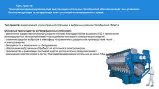 Документ описывает инвестиционный проект по техническому перевооружению котельных в Челябинской области с установкой когенерационных газопоршневых модульных установок. Основная цель - повысить эффективность использования топлива и снизить вредные выбросы, обеспечивая при этом электроэнергией и теплом местные потребности. Проект должен быть реализован с 2013 по 2015 год с ожидаемой внутренней нормой рентабельности 18,5%.