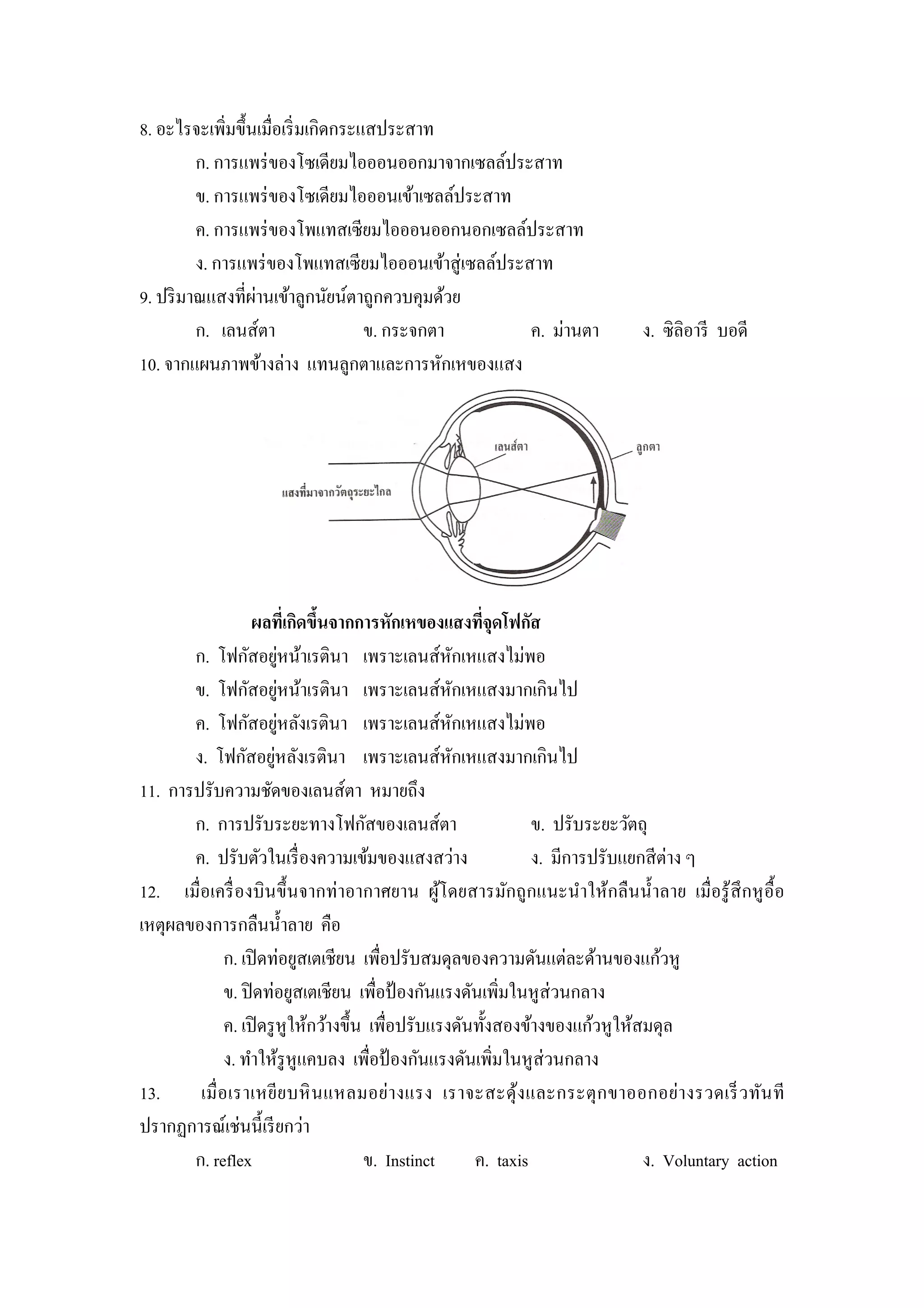 ก. การแพร่ ของโซเดียมไอออนออกมาจากเซลล์ประสาท ข. การแพร่ ของโซเดียมไอออนเข้าเซลล์ประสาท ค. การแพร่ ของโพแทสเซียมไอออนออกนอกเซลล์ประสาท ง. การแพร่ ของโพแทสเซียมไอออนเข้าสู่เซลล์ประสาท ่ 9. ปริ มาณแสงที่ผานเข้าลูกนัยน์ตาถูกควบคุมด้วย ก. เลนส์ตา ข. กระจกตา ค. ม่านตา ง. ซิลิอารี บอดี 10. จากแผนภาพข้างล่าง แทนลูกตาและการหักเหของแสง ผลทีเ่ กิดขึนจากการหักเหของแสงทีจุดโฟกัส ้ ่ ่ ก. โฟกัสอยูหน้าเรตินา เพราะเลนส์หกเหแสงไม่พอ ั ่ ข. โฟกัสอยูหน้าเรตินา เพราะเลนส์หกเหแสงมากเกินไป ั ่ ค. โฟกัสอยูหลังเรตินา เพราะเลนส์หกเหแสงไม่พอ ั ่ ง. โฟกัสอยูหลังเรตินา เพราะเลนส์หกเหแสงมากเกินไป ั 11. การปรับความชัดของเลนส์ตา หมายถึง ก. การปรับระยะทางโฟกัสของเลนส์ตา ข. ปรับระยะวัตถุ ค. ปรับตัวในเรื่ องความเข้มของแสงสว่าง ง. มีการปรับแยกสี ต่าง ๆ 12. เมื่อเครื่ องบินขึ้นจากท่าอากาศยาน ผูโดยสารมักถูกแนะนําให้กลืนนํ้าลาย เมื่อรู ้สึกหู อ้ื อ ้ เหตุผลของการกลืนนํ้าลาย คือ ก. เปิ ดท่อยูสเตเชียน เพื่อปรับสมดุลของความดันแต่ละด้านของแก้วหู ข. ปิ ดท่อยูสเตเชียน เพื่อป้ องกันแรงดันเพิ่มในหูส่วนกลาง ค. เปิ ดรู หูให้กว้างขึ้น เพื่อปรับแรงดันทั้งสองข้างของแก้วหูให้สมดุล ง. ทําให้รูหูแคบลง เพื่อป้ องกันแรงดันเพิ่มในหูส่วนกลาง 13. เมื่ อ เราเหยีย บหิ น แหลมอย่า งแรง เราจะสะดุ ้ง และกระตุ ก ขาออกอย่า งรวดเร็ ว ทัน ที ปรากฏการณ์เช่นนี้เรี ยกว่า ก. reflex ข. Instinct ค. taxis ง. Voluntary action