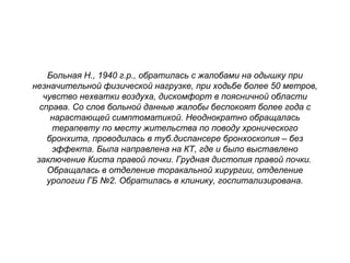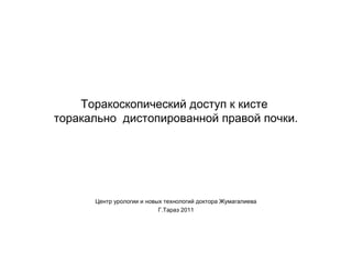 В документе описан случай пациентки с правосторонней дистопией почки и кистой, которая нуждалась в хирургическом вмешательстве. Проведена торакоскопия с удалением кисты и дренированием плевральной полости, операция прошла без осложнений и пациентка была выписана через 5 дней. Послеоперационный период протекал успешно, пациентка восстановила физическую активность.