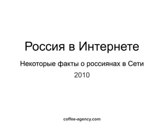 Документ предоставляет обзор интернета в России в 2010 году, отмечая, что 37% россиян выходят в сеть хотя бы раз в месяц, а 22% - ежедневно. Он также подчеркивает рост интернет-аудитории на 65% за 4 года, с основными направлениями использования сети - поиск информации и общение. Кроме того, выделяются 'люди XXI века', которые активно используют интернет и финансовые услуги, стремятся к саморазвитию и заботятся о здоровье.