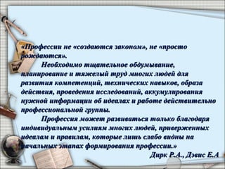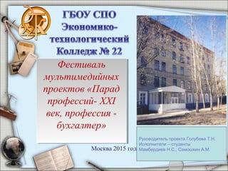 Документ описывает фестиваль мультимедийных проектов «Парад профессий - XXI век», посвященный профессии бухгалтера, который проходил в Москве в 2015 году. Участники, включая студентов, получили теоретические и практические знания, проходя обучение, семинары и практику у работодателей. Также упоминаются различные виды контроля знаний и мероприятия для дальнейшего профессионального развития студентов в области бухгалтерского учета и налогообложения.