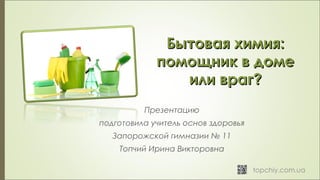 Документ обсуждает опасности, связанные с использованием бытовой химии, подчеркивая риск для здоровья и окружающей среды. Он описывает вредные вещества, содержащиеся в различных чистящих средствах, и их отрицательные эффекты на человека и природу. Также предоставляются рекомендации по более безопасному выбору и хранению бытовых химических средств.