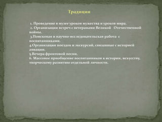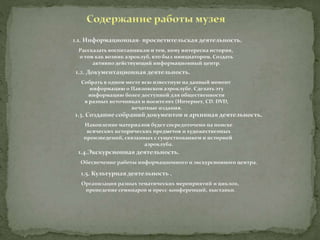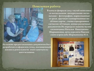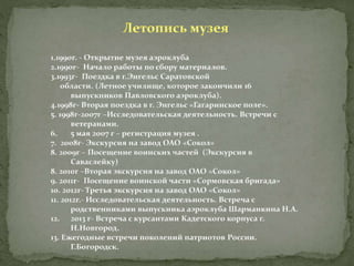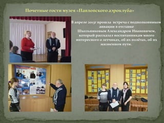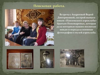 Документ описывает историю Павловского аэроклуба, его главного инициатора Михаила Сергеевича Хорошева и основные этапы деятельности клуба с 1936 по 1940 год, включая достижения его выпускников. Аэроклуб сыграл значительную роль в подготовке летчиков, которые участвовали во Второй мировой войне, многие из которых были награждены. Музей аэроклуба проводит тематические мероприятия, способствующие преемственности поколений и уважению к истории страны.