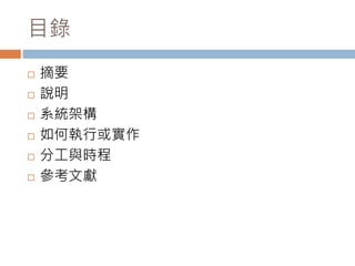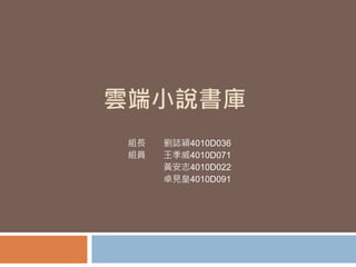 本文件介绍了将书籍电子化并存储在云端的项目,旨在解决实体书籍体积大和重量重的问题。该系统的优点包括便捷的访问和分享,同时也提到缺点,如缺乏书香味和对儿童视力的潜在影响。文档还详细描述了系统架构、实施方法和团队分工。