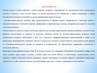 Документ описывает проектную деятельность с детьми старшего дошкольного возраста «По дорогам сказок», направленную на духовно-нравственное развитие через сказку. Основные цели проекта включают коррекцию эмоционально-волевой сферы и социальную адаптацию детей, а также совместную творческую деятельность с родителями. Реализация проекта включает тематические занятия, игры и художественную литературу, что способствует усвоению детьми нравственных понятий и формированию гуманистических чувств.