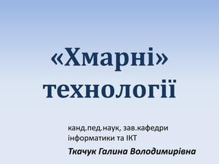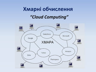 Хмарні обчислення (англ. Cloud Computing) — це модель забезпечення повсюдного та зручного доступу на вимогу через мережу до спільного пулу обчислювальних ресурсів, що підлягають налаштуванню (наприклад, до комунікаційних мереж, серверів, засобів збереження даних, прикладних програм та сервісів), і які можуть бути оперативно надані та звільнені з мінімальними управлінськими затратами та зверненнями до провайдера.