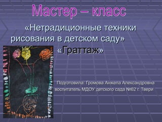 Документ описывает нетрадиционные техники рисования, применяемые в детском саду, в частности технику граттаж. Основная цель - ознакомить участников мастер-класса с методами этой техники и расширить их навыки в рисовании. В документе также представлены различные подходы к нетрадиционному рисованию, такие как ниткопись, кляксография и монотипия.