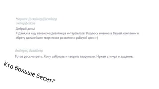 Документ содержит советы для мобильных дизайнеров о том, как продавать себя и строить свое портфолио, акцентируя внимание на важности самооценки и презентации. Основные этапы проектирования мобильных приложений также перечислены, включая сбор требований и тестирование. Документ затрагивает и пользовательский опыт, подчеркивая необходимость понимания потребностей пользователей и адаптации интерфейса.
