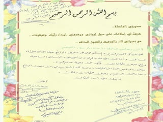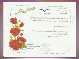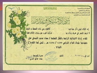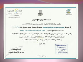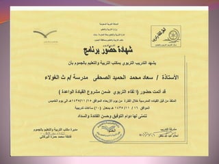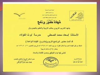 يتحدث المستند عن السيرة الذاتية لمحمد سعاد عبدالحميد، والذي يحمل بكالوريوس في اللغة العربية والعلوم الاجتماعية، ويتضمن معلومات عن رؤيته ورسالة لتحقيق أداء مميز في التعليم. كما يصف المستند البرامج التدريبية التي شارك فيها والتواريخ المتعلقة بها، بهدف تطوير المهارات القيادية والإبداعية. يتناول أيضًا أهداف المستند في تعزيز جودة التعليم والشراكات الفعالة.