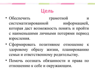 Документ предоставляет рекомендации для девочек-подростков по вопросам здорового образа жизни, личной гигиены и сексуального воспитания. Он акцентирует внимание на важности осведомленности о менструации, контрацепции и последствиях раннего начала половой жизни. Также подчеркнута необходимость обращения к специалистам для получения достоверной информации и советов на эти темы.