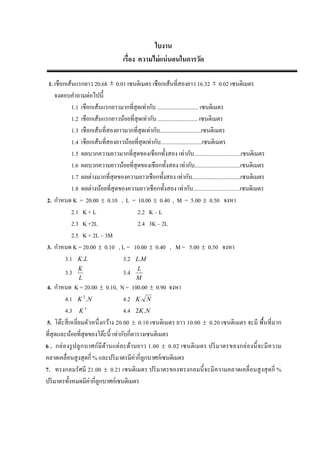 เรื่อง ความไม่ แน่ นอนในการวัด 1. เชือกเส้นแรกยาว 20.68 0.01 เซนติเมตร เชือกเส้นที่สองยาว 16.32 0.02 เซนติเมตร จงตอบคาถามต่อไปนี้ 1.1 เชือกเส้นแรกยาวมากที่สุดเท่ากับ ............................. เซนติเมตร 1.2 เชือกเส้นแรกยาวน้อยที่สุดเท่ากับ ............................ เซนติเมตร 1.3 เชือกเส้นที่สองยาวมากที่สุดเท่ากับ.............................เซนติเมตร 1.4 เชือกเส้นที่สองยาวน้อยที่สุดเท่ากับ.............................เซนติเมตร 1.5 ผลบวกความยาวมากที่สุดของเชือกทั้งสอง เท่ากับ.................................เซนติเมตร 1.6 ผลบวกความยาวน้อยที่สุดของเชือกทั้งสอง เท่ากับ................................เซนติเมตร 1.7 ผลต่างมากที่สุดของความยาวเชือกทั้งสอง เท่ากับ..................................เซนติเมตร 1.8 ผลต่างน้อยที่สุดของความยาวเชือกทั้งสอง เท่ากับ.................................เซนติเมตร 2. กาหนด K = 20.00 0.10 , L = 10.00 0.40 , M = 5.00 0.50 จงหา 2.1 K + L 2.2 K – L 2.3 K +2L 2.4 3K – 2L 2.5 K + 2L – 3M 3. กาหนด K = 20.00 0.10 , L = 10.00 0.40 , M = 5.00 0.50 จงหา 3.1 K.L 3.2 L.M K L 3.3 3.4 L M 4. กาหนด K = 20.00 0.10, N = 100.00 0.90 จงหา 4.1 K 2 .N 4.2 K. N 4.3 K 3 4.4 2K.N 5. โต๊ะสี่ เหลี่ยมตัวหนึ่ งกว้าง 20.00 0.10 เซนติเมตร ยาว 10.00 0.20 เซนติเมตร จะมี พื้นที่มาก ที่สุดและน้อยที่สุดของโต๊ะนี้ เท่ากับกี่ตารางเซนติเมตร 6 . กล่ องรู ป ลู ก บาศก์มี ด้า นแต่ ล ะด้า นยาว 1.00 0.02 เซนติ เมตร ปริ มาตรของกล่ องนี้ จะมี ค วาม คลาดเคลื่อนสู งสุ ดกี่ % และปริ มาตรมีค่ากี่ลูกบาศก์เซนติเมตร 7. ทรงกลมรัศมี 21.00 0.21 เซนติ เมตร ปริ มาตรของทรงกลมนี้ จะมี ความคลาดเคลื่ อนสู งสุ ดกี่ % ปริ มาตรทั้งหมดมีค่ากี่ลูกบาศก์เซนติเมตร
