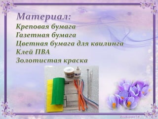 Документ описывает творческий проект воспитанницы подготовительной группы детского сада, направленный на развитие художественных навыков и фантазии. В процессе работы создается корзина из газетной бумаги, цветы из креповой бумаги и бабочки в технике квилинг. Завершенная работа представляет собой композицию под названием 'весенняя мечта'.