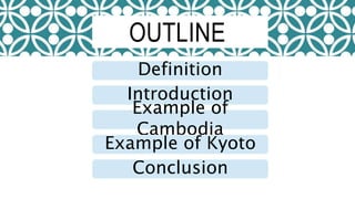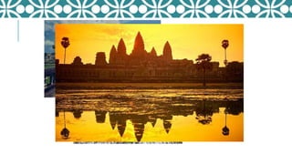 This document discusses culture tourism in Cambodia and Kyoto, Japan. It provides examples of culture tourism in Cambodia, focusing on the ancient Khmer Empire sites like Angkor Wat from the 9th to 15th centuries. It describes the architecture and religions of Hinduism and Buddhism seen in these sites. In Kyoto, it discusses popular temples, shrines, food, traditional arts like Noh and geisha, and recommends a summer trip exploring the Gion Festival, running along the Kamo River, and experiencing Kyoto's modern cultural life.