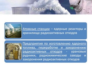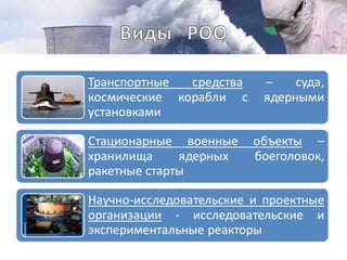 Документ представляет методические материалы, объясняющие риски и последствия радиационных аварий на радиационно-опасных объектах (РОО), таких как атомные станции. Настоящие проблемы включают возможные массовые радиационные поражения, радиоактивное загрязнение и долгосрочные последствия для здоровья человека и окружающей среды. Особое внимание уделяется важности понимания радиации и ее потенциальной опасности, несмотря на то, что в малых дозах она может быть безвредной.