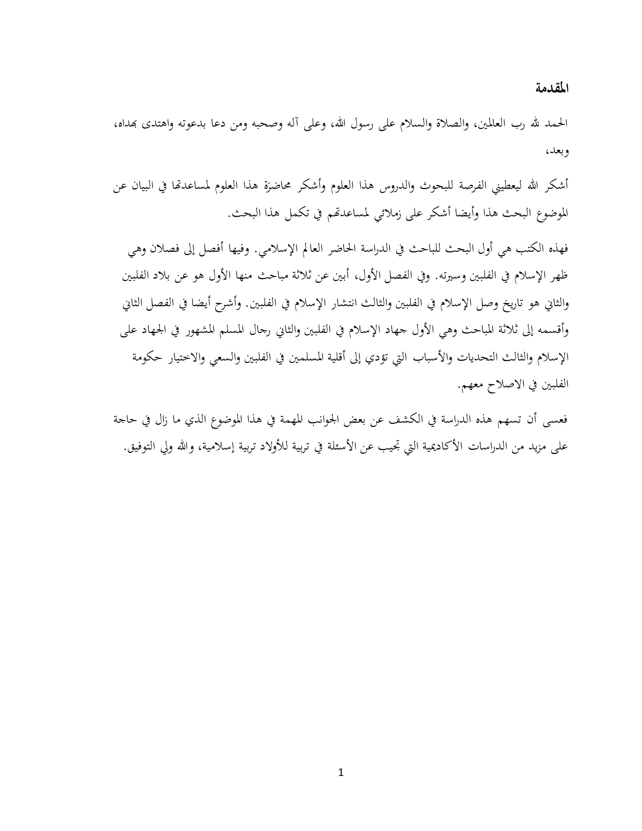 يتناول البحث تاريخ الإسلام في الفلبين، بدءًا من وصول الإسلام عبر التجار والمعلمين، وصولًا إلى تأثيره على المجتمع المحلي. يناقش البحث أيضًا التحديات التي واجهها المسلمون في الفلبين، وأهمية الجهاد في المحافظة على الهوية الإسلامية. كما يتطرق إلى التركيب الاجتماعي والديني للسكان في الفلبين، مع التركيز على الأقلية المسلمة وتأثير الاستعمار الأوروبي.