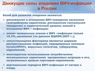 Документ описывает концепцию превентивного обучения в области профилактики ВИЧ-инфекции и СПИДа в образовательной среде, утвержденную в России. Основные проблемы включают высокие уровни инфицирования, низкий уровень знаний и необходимость просвещения для изменения поведения. Цель концепции — разработать согласованные действия по предотвращению распространения инфекций среди детей и молодежи, используя межведомственное взаимодействие и создание адаптированных образовательных программ.