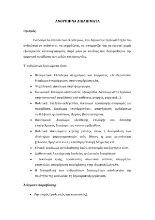 ΑΝΘΡΩΠΙΝΑ ΔΙΚΑΙΩΜΑΤΑ<br />Ορισμός.<br/>Εννοούμε το σύνολο των ελευθεριών, που δηλώνουν τη δυνατότητα του ανθρώπου να σκέπτεται, να εκφράζεται, να αποφασίζει και να ενεργεί χωρίς εξωτερικούς καταναγκασμούς, παρά μόνο με κανόνες που διασφαλίζουν την αρμονική συμβίωση των μελών της κοινωνίας.<br />Τ’ ανθρώπινα δικαιώματα είναι:<br />Πνευματικά: Ελευθερία στοχασμού και έκφρασης, ελευθεροτυπία, δικαίωμα στη μόρφωση, στην ενημέρωση κ.λπ.<br />Ψυχολογικά: Δικαίωμα στην ψυχαγωγία.<br />Κοινωνικά: Ισονομία-ισοπολιτεία, αξιοκρατία, δικαίωμα στην πρόνοια, στην κοινωνική ασφάλιση (από ασθένεια, ανεργία, γηρατειά…).<br />Πολιτικά: Εκλέγειν-εκλέγεσθαι, δικαίωμα προσφυγής-αναφοράς για παραβίαση, δικαίωμα «συνέρχεσθαι», απαγόρευση αυθαίρετων συλλήψεων, φυλακίσεων, εξορίας, βασανιστηρίων.<br />Οικονομικά: Δικαίωμα ελεύθερης επιλογής και άσκησης επαγγέλματος, δικαίωμα του «συνεταιρίζεσθαι».<br />Πολιτικά: Δικαιώματα «τρίτης γενιάς», όπως η διασφάλιση των ιδιαίτερων χαρακτηριστικών ενός έθνους ή μιας μειονότητας (γλώσσα, θρησκεία κ.λ.π), ελεύθερη επιλογή δόγματος κ.ά.<br />Εθνικά: Δικαίωμα αυτοδιάθεσης λαών, αυτονομία-ανεξαρτησία κ.λπ. <br />Διεθνιστικά: Απαγόρευση δουλείας, φυλετικών διακρίσεων.<br /> Δικαίωμα ζωής, προστασίας ιδιωτικού ασύλου, απορρήτου επιστολών, απαγόρευση παρέμβασης στην ιδιωτική ζωή κ.λπ.<br />Η διασφάλιση των ανθρωπίνων δικαιωμάτων αποδεικνύει την ποιότητα της κοινωνίας, τη δημοκρατική οργάνωση.<br />Δείγματα παραβίασης<br />Ρατσισμός (φυλετικός και κοινωνικός).<br />Παραβίαση πολιτικών δικαιωμάτων:<br />του εκλέγειν και εκλέγεσθαι<br />ελευθερίας διακίνησης ιδεών, έκφρασης πολιτικών πεποιθήσεων<br />θρησκευτικής συνείδησης.<br />παρακολούθηση επικοινωνιών.<br />λογοκρισία, φίμωση τύπου, έλεγχος ΜΜΕ για διοχέτευση κυρίαρχης ιδεολογίας.<br /> παράνομες, χωρίς ένταλμα, συλλήψεις, κρατήσεις, φυλακίσεις πολιτών<br />βία (σωματική, ψυχολογική), τρομοκρατία έως και πόλεμος.<br />Απουσία: ισοπολιτείας , ισότιμης μόρφωσης, κοινωνικής ασφάλισης, περίθαλψης, κατοικίας, ισονομίας, ίσων ευκαιριών, αξιοκρατίας <br />ανεργία.<br />πείνα, στερήσεις, εξαθλίωση κυρίως στις χώρες του Τρίτου Κόσμου.<br />παραβίαση δικαιωμάτων των μειονοτικών πληθυσμών (παραβίαση δικαιώματος ανεξιθρησκίας, στέρηση δικαιώματος μόρφωσης).<br />παραπληροφόρηση.<br />Αιτίες παραβίασης<br />Επεκτατική πολιτική ισχυρών κρατών (πόλεμοι, πυρηνική απειλή, παραβίαση δικαιώματος αυτοδιάθεσης λαών).<br />Ρατσιστικά κινήματα και ιδεολογίες που κατευθύνονται από πολιτικούς και οικονομικούς κύκλους.<br />Αυταρχικές δομές πολιτικών συστημάτων, όπως είναι κυρίως οι δικτατορίες.<br />Οι προκλητικές οικονομικές και κοινωνικές ανισότητες.<br />Χαμηλό μορφωτικό επίπεδο.<br />Άγνοια δικαιωμάτων από τον πολίτη.<br />Το άτομο γίνεται εύκολα θύμα χειραγώγησης.<br />Έλεγχος από οικονομικά και κοινωνικά συμφέροντα.<br />Τρόποι αντιμετώπισης<br />Συνειδητοποίηση της σημασίας των ανθρώπινων δικαιωμάτων για τη διασφάλιση της αξιοπρέπειας και δικαιοσύνης.<br />Παρέμβαση ατόμου σε περιπτώσεις παραβίασης τους. <br />Συμμετοχή σε συλλογικές δραστηριότητες (κινήματα, οργανώσεις) για έλεγχο αυθαιρεσιών οποιασδήποτε εξουσίας<br />Προστασία δικαιωμάτων (για ειρήνη, πυρηνικό αφοπλισμό, διατήρηση φυσικού περιβάλλοντος, κατοχύρωση πολιτικών κ.α, δικαιωμάτων)<br />Κατάργηση ανισοτήτων, εκμετάλλευσης κλπ.<br />Επικράτηση υψηλών αξιών (ελευθερίας, ισότητας, δικαιο