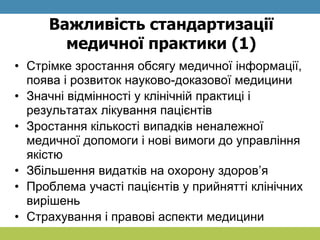 •Стандартизація медичної допомоги є важливою