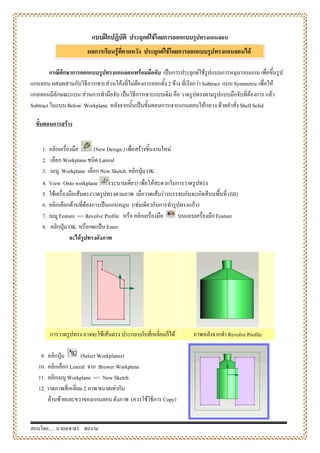 ผลการเรียนรูที่คาดหวัง ประยุกตใชโดยการออกแบบรูปทรงแกนลอนได กรณีศึกษาการออกแบบรูปทรงแกนลอนพรอมมือจับ เปนการประยุกตใชรูปแบบการหมุนรอบแกน เพื่อขึ้นรูป แกนลอน ผสมผสานกับวิธีการเซาะสวนโคงที่ไมตองการออกทั้ง 2 ขาง ที่เรียกวา Subtract แบบ Symmetric เพื่อให แกลลอนมีลักษณะแบน สวนการทํามือจับ เปนวิธีการเซาะแบบเดิม คือ วาดรูปทรงตามรูปแบบมือจับที่ตองการ แลว Subtract ในแบบ Below Workplane หลังจากนั้นเปนขั้นตอนการเจาะแกนลอนใหกลวง ดวยคําสั่ง Shell Solid ขั้นตอนการสราง 1. คลิกเครื่องมือ (New Design ) เพื่อสรางชิ้นงานใหม 2. เลือก Workplane ชนิด Lateral 3. เมนู Workplane เลือก New Sketch คลิกปุม OK 4. View Onto workplane (ระนาบเดี่ยว) เพื่อใหสะดวกในการวาดรูปทรง 5. ใชเครื่องมือเสนตรงวาดรูปทรงตามภาพ เมื่อวาดเสนรางบรรจบกันจะเกิดสีบนพื้นที่ (fill) 6. คลิกเลือกดานที่ตองการเปนแกนหมุน (เชนเดียวกับการทํารูปทรงแกว) 7. เมนู Feature --> Revolve Profile หรือ คลิกเครื่องมือ บนแถบเครื่องมือ Feature 8. คลิกปุม OK หรือกดแปน Enter จะไดรูปทรงดังภาพ การวาดรูปทรง อาจจะใชเสนตรง ประกอบกับสี่เหลี่ยมก็ได ภาพหลังจากทํา Revolve Profile 9. คลิกปุม (Select Workplanes) 10. คลิกเลือก Leteral จาก Brower Workplane 11. คลิกเมนู Workplane --> New Sketch 12. วาดภาพสี่เหลี่ยม 2 ภาพ ขนาดเทากัน ดานซายและขวาของแกนลอน ดังภาพ (ควรใชวิธีการ Copy) สอนโดย… นายเดชาธร พองาม