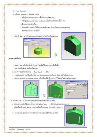14. คลิกมนู Feature --> Extrude Profile - คลิกปุม Subtract material เพื่อกําหนดใหเซาะวัตถุ - คลิกปุม Symmetric about workplane เพื่อกําหนดใหเซาะทั้ง 2 ดาน (ดานนอก และ ดานใน) - กําหนดคา Distance ใหมีคามากพอที่จะเซาะสวนโคงของแกนลอนจนหมด สังเกตจากโครงรางสีเหลือง 15. คลิกปุม OK จะไดภาพแกนลอนที่ถูกตัดสวนโคงเรียบรอย ดังภาพ การเซาะทํามือจับ 1. Select Faces คลิกเลือกพื้นผิวขางใดขางหนึ่งที่ตองการเซาะเปนมือจับ จะสังเกตเห็นพื้นผิวที่เลือกเปนสีแดง 2. คลิกขวาบนพื้นผิวที่เลือก --> New Sketch ---> OK 3. วาดรูปทรงโคง โดยใชรูปสี่เหลี่ยม และ ทรงกลม ประกอบกัน แลวตัดสวนที่ไมตองการออก 4. คลิกมนู Feature --> Extrude Profile แลวใชเมาสจับปุมเหลือง ดึงใหหลุดไปดานหลังแกนลอน 5. คลิกปุม OK จะไดภาพแกนลอนที่มีมือจับเปนสวนโคง ดังภาพ 6. เจาะแกนลอนเพื่อใชบรรจุสงของ โดย Select Faces ---> เลือกสวนปากของแกนลอน ิ่ 7. คลิกเครื่องมือ Shell Solids บนแถบเครื่องมือ Feature กําหนดคา Offset = 2 8. คลิกปุม OK จะไดแกนลอนพรอมมือจับ และเจาะใหกลวง ดังภาพ สอนโดย… นายเดชาธร พองาม